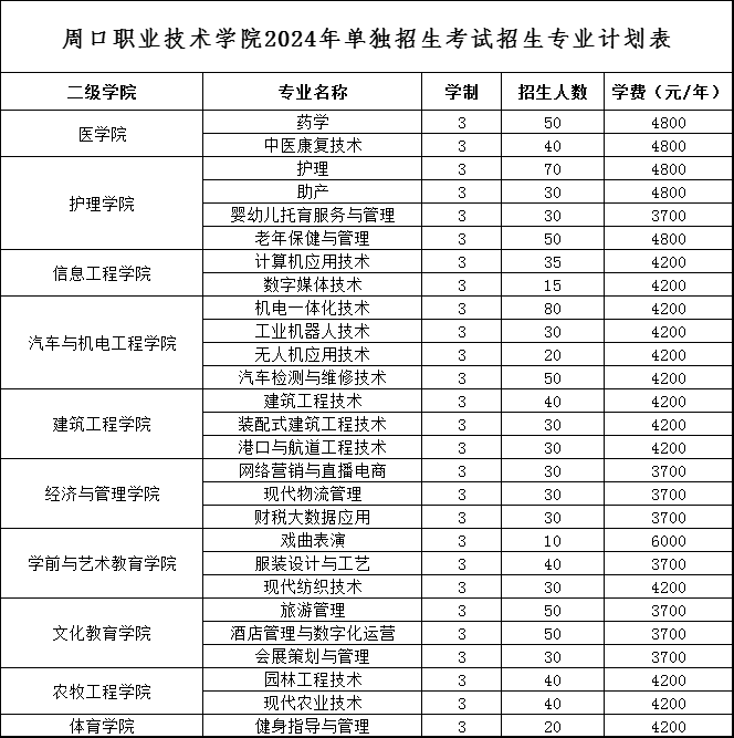 周口职业技术学院2024年单独考试招生章程